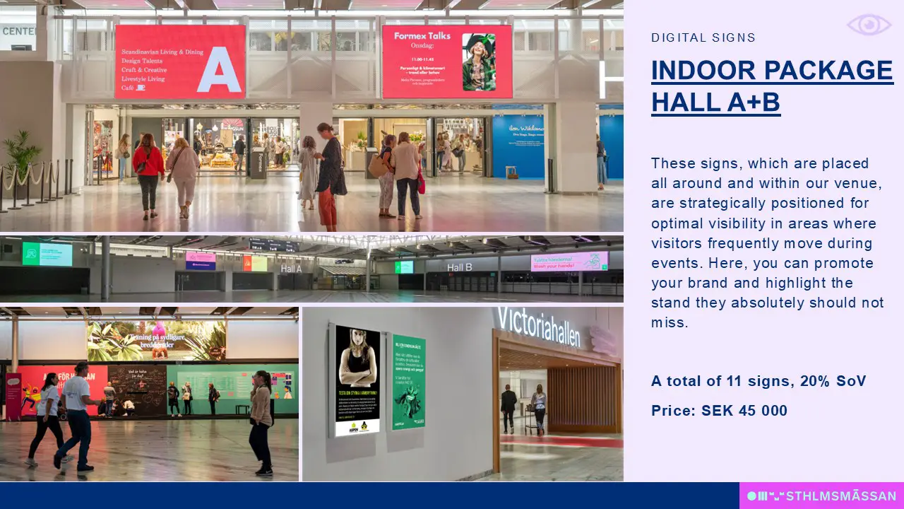 Secure a strong presence across both halls! With the Hall A and Hall B Indoor Package, your brand is featured on eleven digital screens throughout the exhibition, including larger-format placements that deliver enhanced visibility in the busiest visitor flows. A powerful choice for exhibitors looking to maximise reach across the entire event.