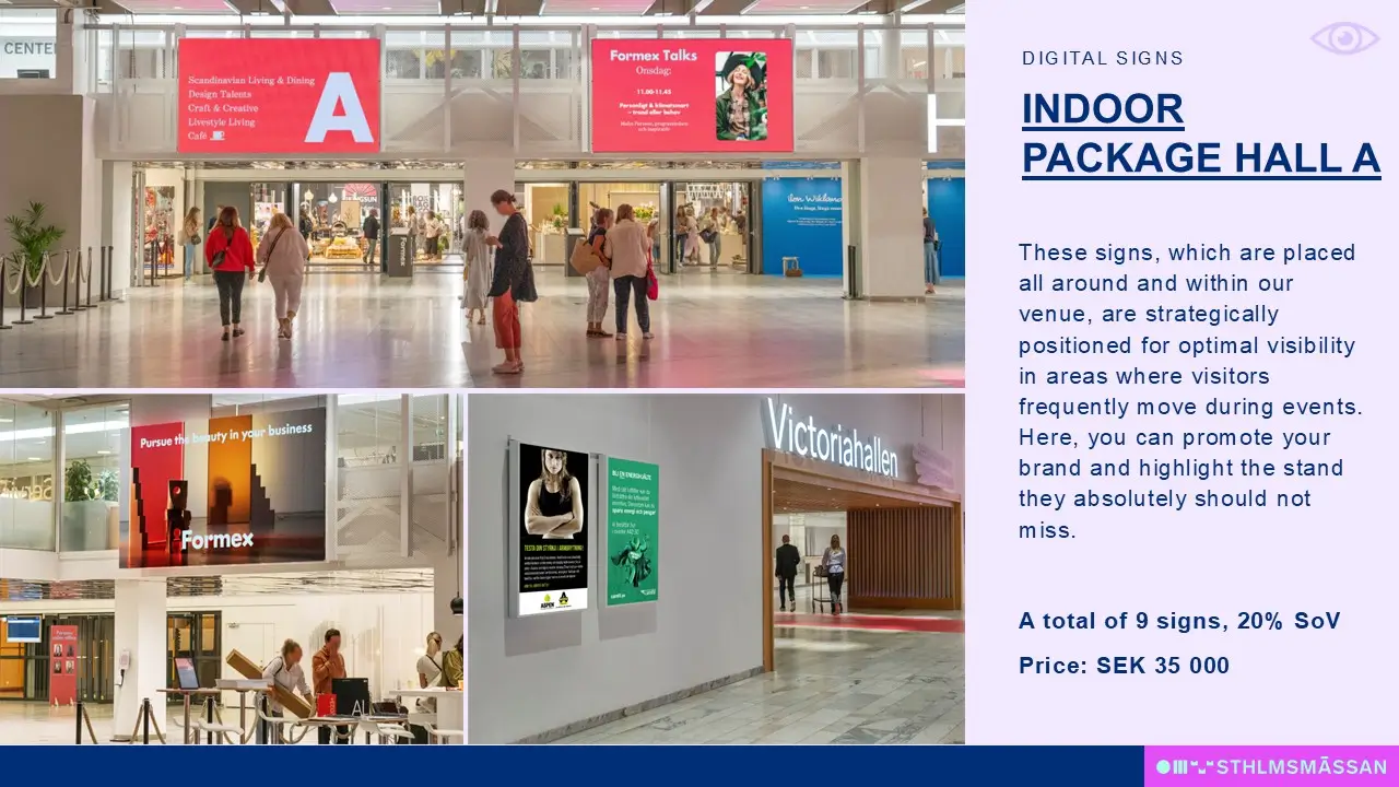Increase your visibility in the heart of Hall A. With nine strategically positioned digital signs in high-traffic areas, your brand gains maximum exposure and stronger opportunities to attract the right audience to your stand.
