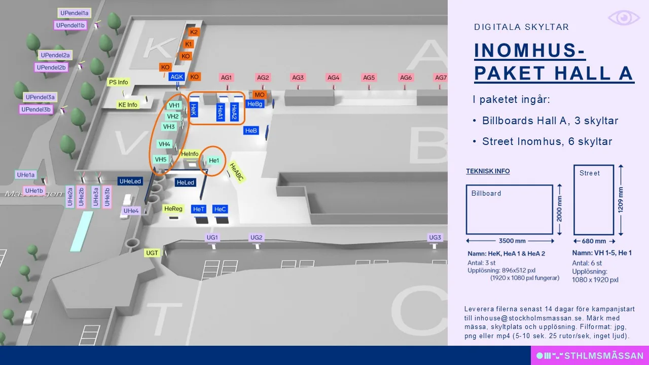 Syns där det händer! Med vårt inomhuspaket i Hall A får du nio digitala skyltar strategiskt placerade i hallens mest trafikerade områden. Det betyder fler ögon på ditt varumärke och bättre förutsättningar att leda besökarna till din monter.