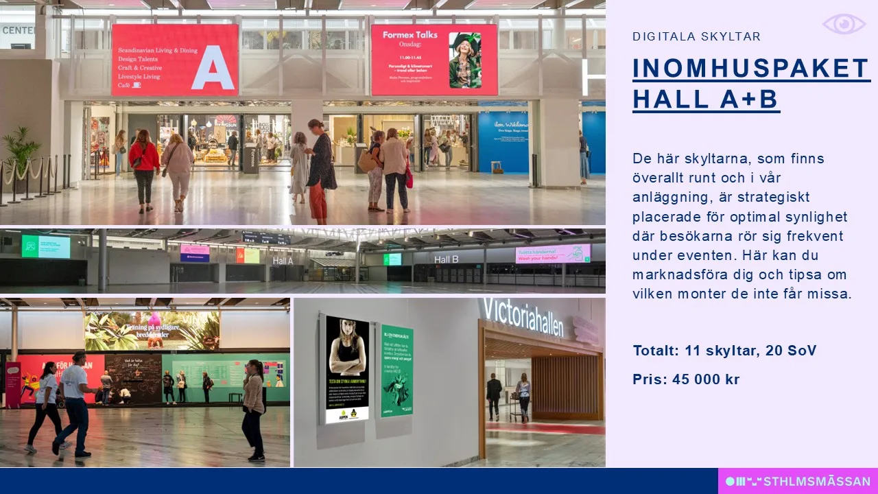 Ta en tydlig position i båda hallarna! Med inomhuspaketet A+B får du elva digitala skyltar i Hall A och B, inklusive större exponeringsytor som ger extra synlighet i de mest trafikerade stråken. Ett starkt val för dig som vill säkerställa bred räckvidd under hela mässan.